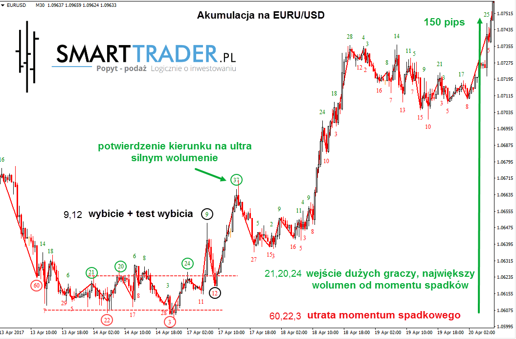 Przeciwnie skorelowana do indeksu dolarowego para EURUSD, ma przed sobą duży opór, w którym na mniejszych interwałach czasowych może pojawić się układ dystrybucyjny. Właściwe strefy czasowe to wykresy h4 i h1 oraz z wykorzystam wolumenu skumulowanego interwał 15 minutowy (aby wziąć sygnały za właściwe muszą tutaj pojawić się dwie, ultra-wysokie fale wyprzedażowe).